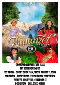 Christmas Panto – Rapunzel – Saturday 30th November 2024 Published: 25th October 2024 Tickets will be on sale from the Welfare Hall, Heol y Felin, Cwmgwrach on the following dates and times: Monday 28th October – 9am to 1pm Tuesday 29th October – 2pm to 5pm Wednesday 30th October – 9am to 1pm Friday 1st November – 1pm to 3pm